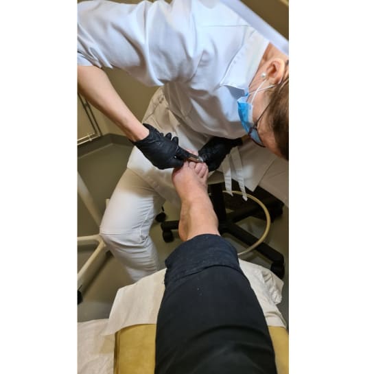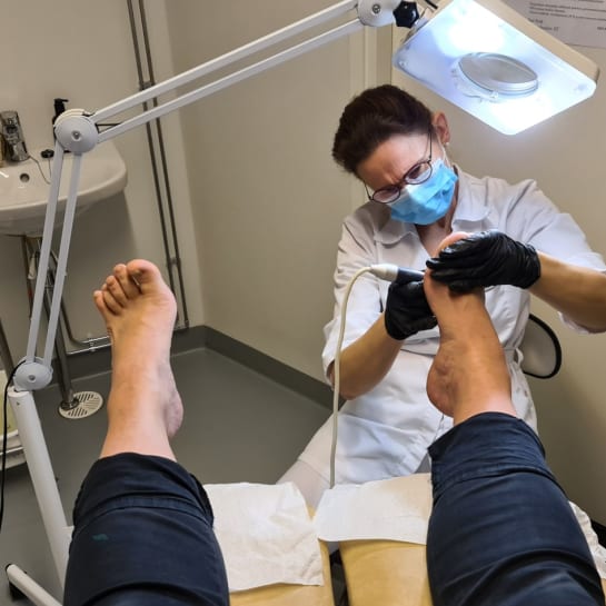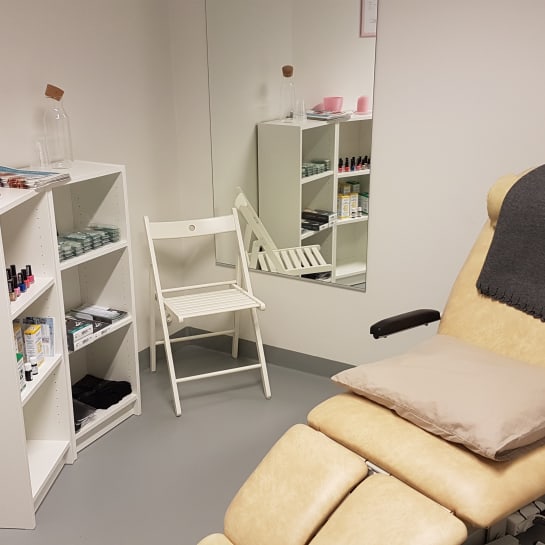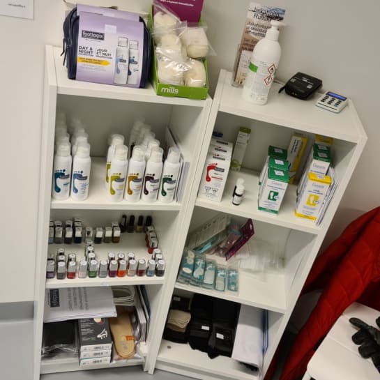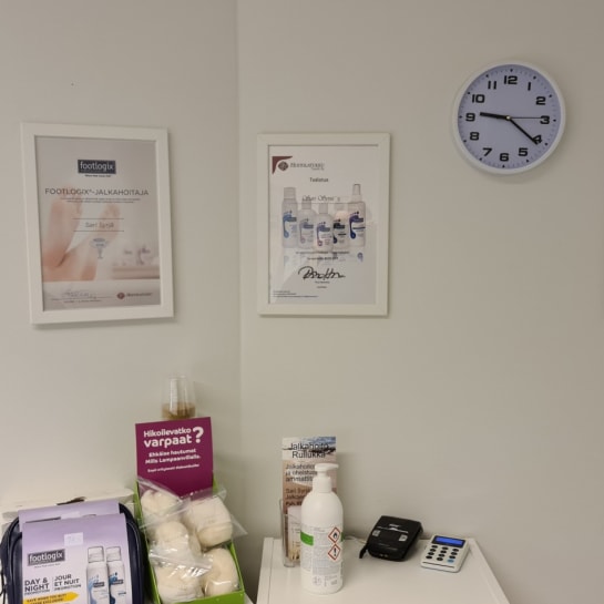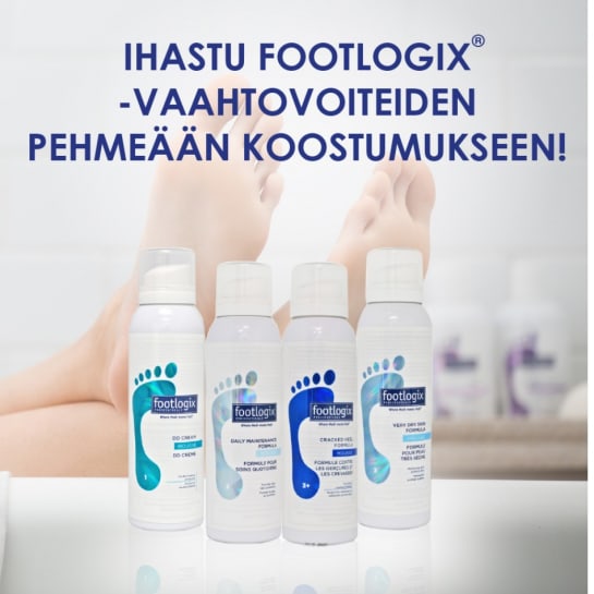 Hoitolassa myynnissä Footlogix vaahtovoiteita. Valikoimasta löytyy myös kiristämättömiä sukkia ja lajitelma kynsilakkoja.